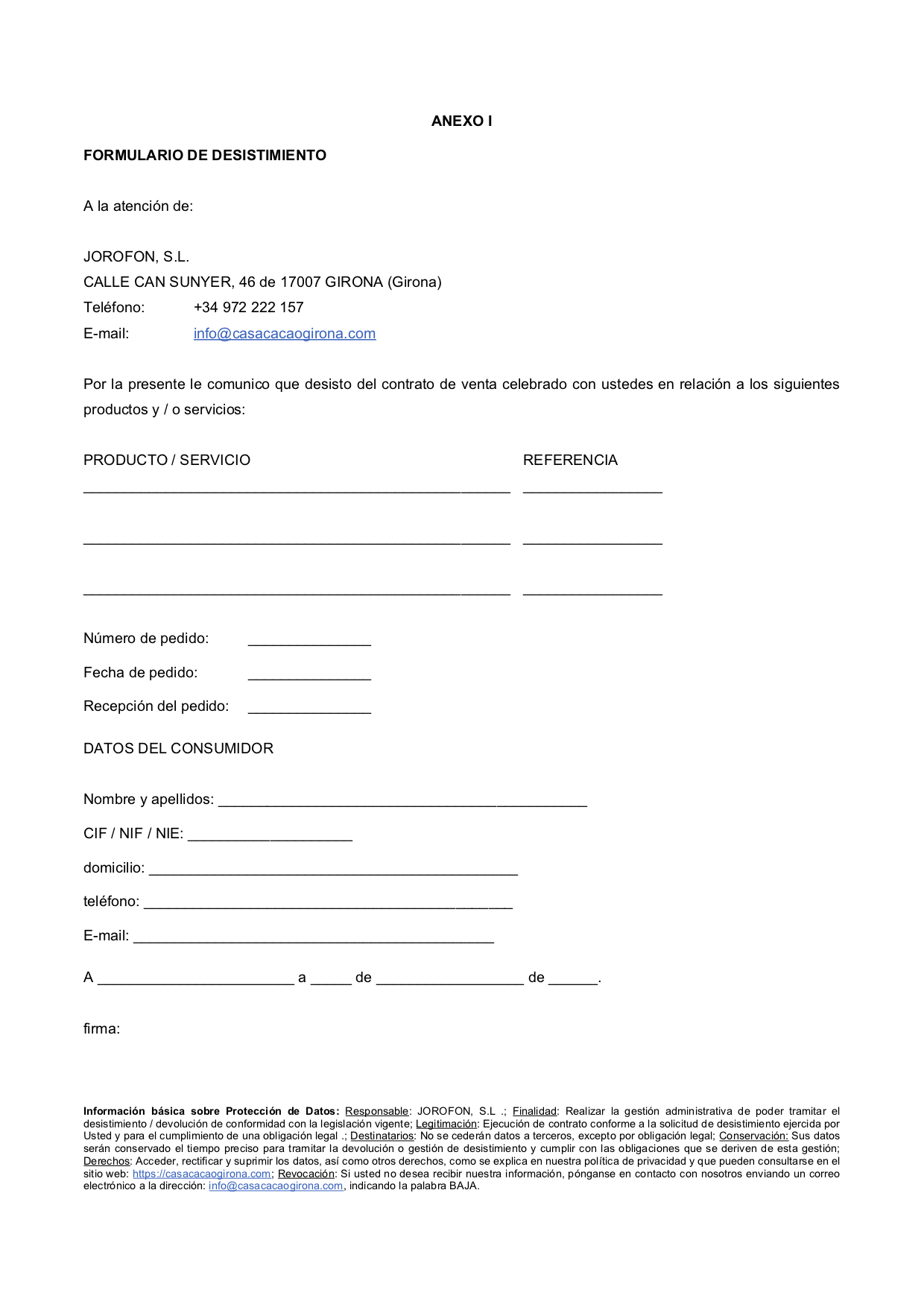 A la atención de JOROFON, S.L., con domicilio social en C/. Can Sunyer, 46 de 17007 GIRONA (Girona) y e-mail shop@cellercanroca.com.