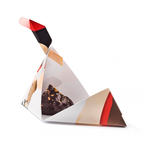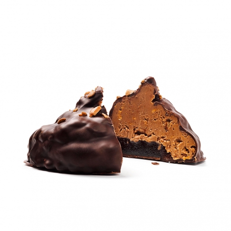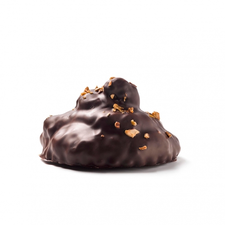 Un exquisito turrón de semillas de girasol caramelizadas y un centro de caramelo blando de yuzu (cítrico de origen japonés), recubierto con chocolate negro.