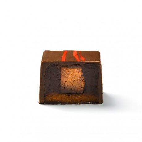 Cremosa ganache de albaricoque con gelatina de mandarina y mazapán de zanahoria. Delicadamente recubierto de chocolate con leche.